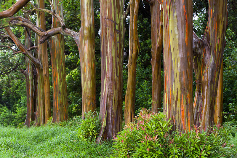 位于美国夏威夷的毛伊岛上有种特别的树-彩虹桉树。因树皮呈现多种颜色而被称为彩虹桉树。它的树皮会随着时间的推移不断变换着颜色。新脱落的外皮所在位置由亮绿色的内皮取代,时间流逝过程中,树皮逐渐变色,由亮绿变蓝色再变成紫色等,不同颜色代表了树皮的不同年龄。