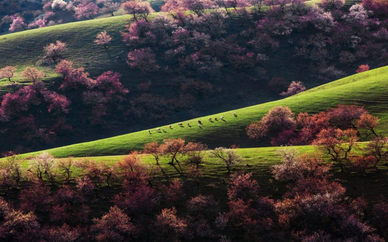每年,这些丘陵都会变成粉红色和白色花的海洋。 作为新疆最大的杏园,这花代表果期季节的开始,同时也使杏谷成为人间少有的仙境。