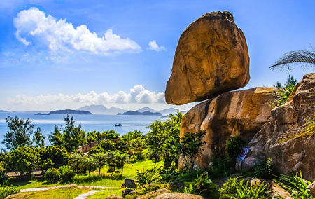 东山风动石以奇、险、悬而居全国各地60多块风动石之最,被誉为“天下第一奇石”。它的奇妙之处在于它前后左右重量平衡极佳,大风吹动时,石体左右晃动,但倾斜到一定角度就不会再动了,所以我们称它为风动石。曾今东山岛发生7.5级地震,山石滚落,屋倒人亡,可风动石却安然无恙。“七七事变”后,日军企图搬走风动石,日舰“太和丸”用钢丝索系于风动石上,开足马力,可多条钢丝索被拉断了,风动石却纹丝未动,最后日军只得放弃这一企图。风动石历经沧桑,依然斜立如故。这块奇石是怎样形成的呢?至今是个难解的谜。