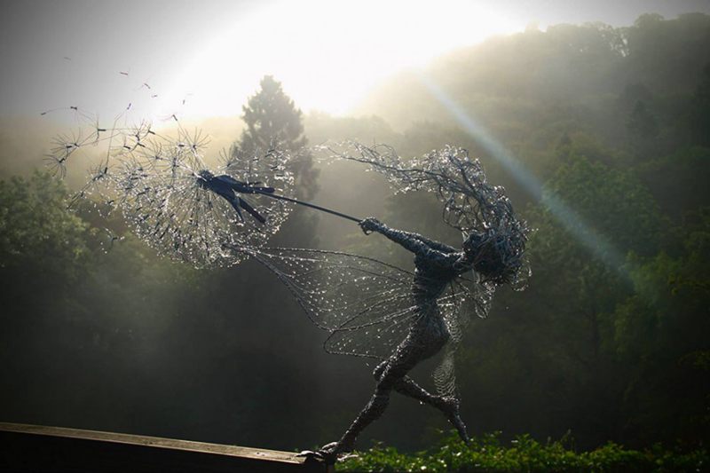 英国的艺术家罗宾·怀特(Robin Wight)采用不锈钢丝,缠绕成带有翅膀的仙子在风中舞蹈的雕塑,既戏剧又惊艳。迷人的制作形态,从微型到真人大小的尺寸范围,似乎它们有一个属于自己的世界,他们动态的姿势,扭曲自己的身体,并保持有风吹拂的蒲公英,实在是完美。